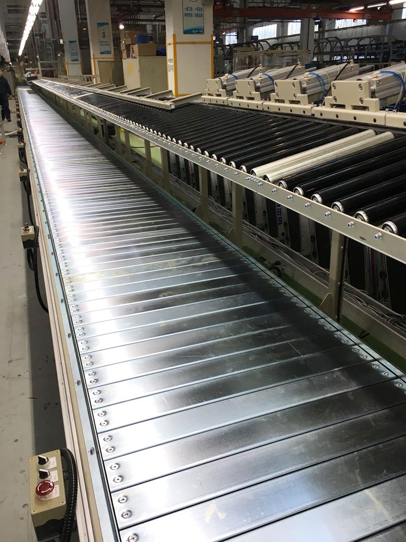 板鏈線由鏈條牽引,承重的鋼板、塑膠板等固定于輸送機(jī)兩側(cè)導(dǎo)軌內(nèi)的鏈條上,作為承重機(jī)構(gòu)。輕型板鏈輸送機(jī)經(jīng)常在家電生產(chǎn)行業(yè)中使用,工位承載能力100KG左右。重型板鏈輸送機(jī)常用于汽車制造、農(nóng)機(jī)制造等工業(yè)領(lǐng)域,工位承載能力2T。鏈板選擇:碳鋼、不銹鋼、木質(zhì)。
