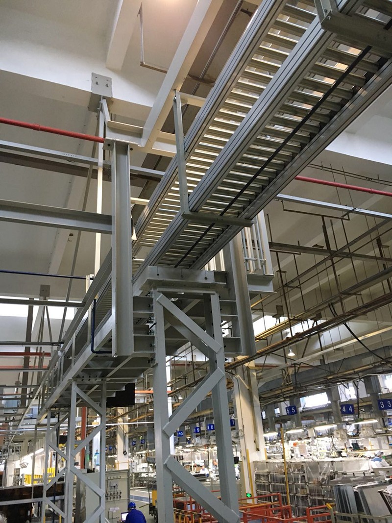 架空輸送流水線(xiàn)是在空間連續(xù)輸送物料的設(shè)備,物料裝在專(zhuān)用箱體或支架上沿預(yù)定軌道運(yùn)行。線(xiàn)體可在空間上下坡和轉(zhuǎn)彎,布局方式自用靈活,占地面積小。應(yīng)用于機(jī)械、汽車(chē)、電子、家用電器、輕工、食品、化工等行業(yè)大批量流水生產(chǎn)作業(yè)中。在輸送工件的過(guò)程中,采用空中多點(diǎn)輸出送,并可調(diào)節(jié)其輸送速度,十分有利于機(jī)械裝配等作業(yè),是國(guó)內(nèi)企業(yè)中使用較多的一種輸送產(chǎn)品。